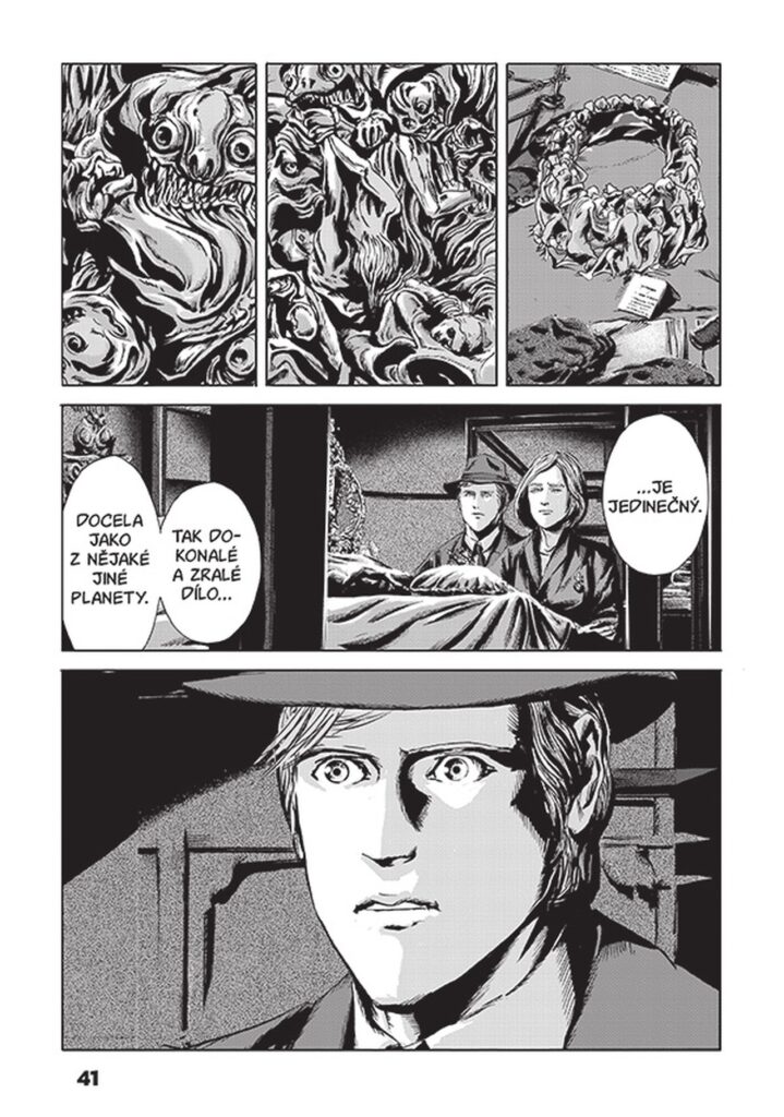 Tanabe využíva japonskú mangu nie ako obmedzenie, ale ako výhodu. Čiernobiela estetika, husté šrafovanie, práca s kontrastom svetla a tmy, to všetko slúži Lovecraftovej atmosfére lepšie, než by to zvládla plnofarebná európska kresba.